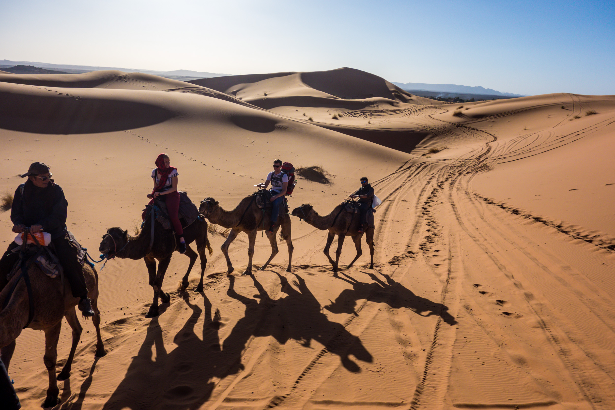 Sahara desert trekking (on foot) is a scenery-adventure that highlights the most salient aspects of the Nomadic culture. The Sahara desert trekking presents a precious precis of the Nomadic life and lifestyle. It is, in fact, a superb-sophistication school shedding light on the local flora and fauna as well as Nomadic living. Accompanied by Nomadic local team and camel caravan, guests walk on the vast expanse of dunes from one destination to another as Nomads used to. We wholeheartedly invite you invite you to get immersed in the Nomadic life through and through. All Sahara desert trekking trips start from the village of M’hamid El Ghizlane. We organize trekking trips from the beginning of September to the ending of May because of cold and warm temperatures.